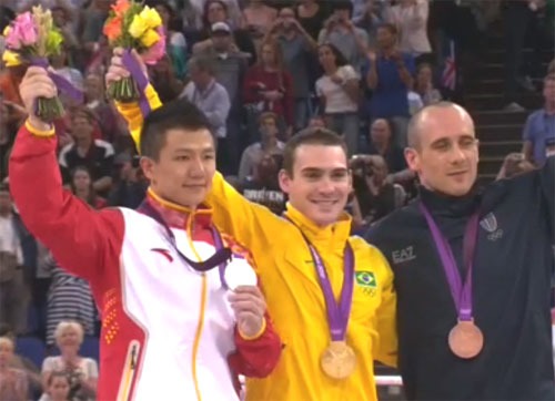 Arthur Zanetti (centro) recebe a medalha de ouro, Yibing Chen da China ficou com a prata e Matteo Morandi da Itália com o bronze