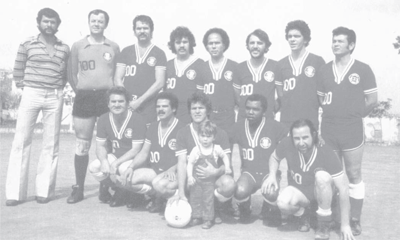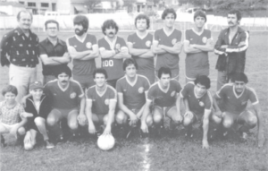 para a esquerda, o técnico José Deusdedite da Silva, Toninho Momesso, Norival Giovanetti, Jairzinho (o maior artilheiro do clube com 466 gols), o saudoso romualdo, Clovis, Angelo Luiz Cavalline “Tetê”, Ari Pedro, Cavalcante. Agachados estão: José Pires Maia “Zezé”, Fernando Aureo, Arizinho, Pelézinho, e o ponteiro Zé Roberto de saudosa
