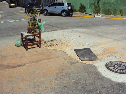 Morador das imediações da av. Paranapanema com Raymundo Maffei, teve que tomar providências alternativas para não causar acidente, buraco deixado pela autarquia DAE-SCS. Três equipes estiveram no local para consertar o buraco e nenhuma conclui, só tiraram a primeira cadeira e levaram embora. O morador reclamante se viu na obrigação de colocar outra no local. Faz mais de mês que este buraco se encontra aberto. Daqui a pouco os funcionários do DAE irão ter mais seis cadeiras na autarquia, se não tomarem as devidas providências urgentes. Alguém precisa de cadeiras na administração?… Nem o ouvidor tomou providências ainda…