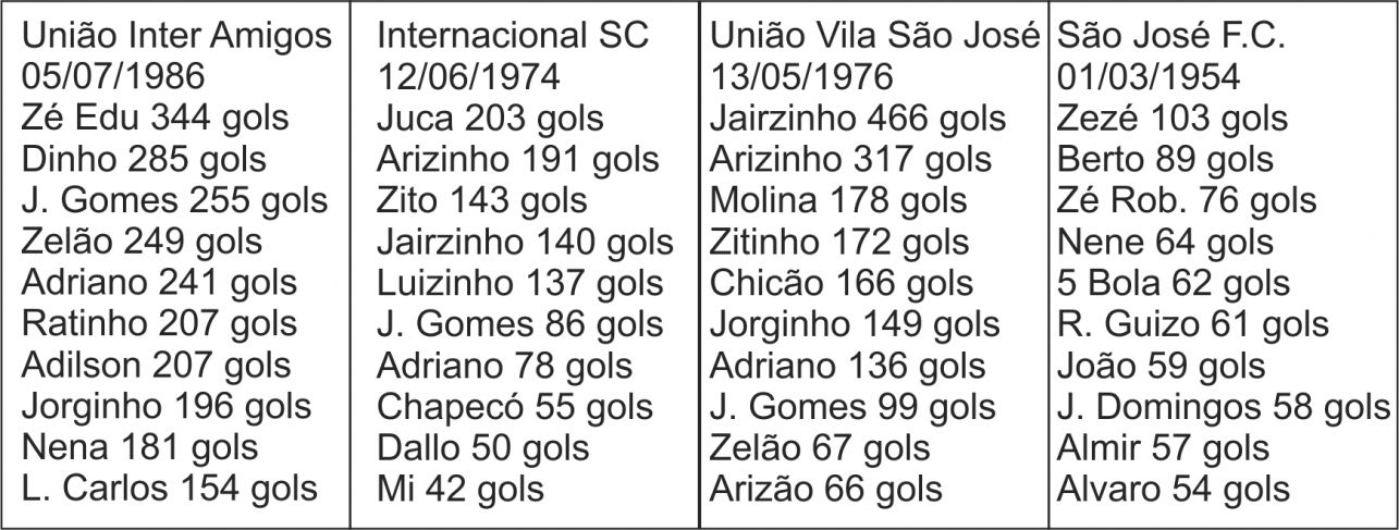 Lembrando ainda que o União Inter Amigos tem 5.725 gols, Internacional S.C. 3.868 gols, União Vila São José 3.531 gols e o São José FC com 3034 gols. Totalizando os quatro clubes 16.158 gols em São Caetano do Sul.