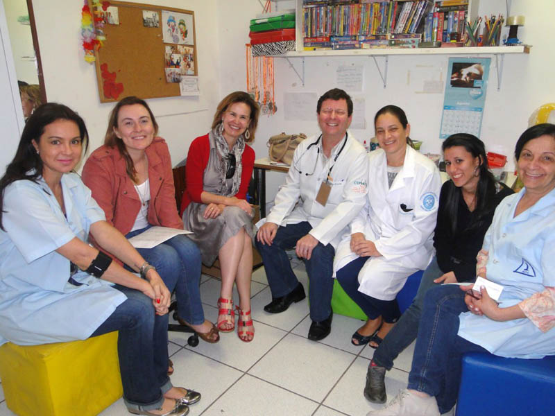 Kátia Dotto, voluntária da Oncopediatria; Ursula Longo, Coordenadora de Voluntários da Make a Wish; Claudia Lombardi, diretora executiva da Make a Wish; Dr. Jairo Cartum, coordenador do Ambulatório de Oncopediatria; Dra. Helaine Cristina de Castro, oncopediatra; Paula Mergel e Rosa Vidotti, voluntárias da Oncopediatria.