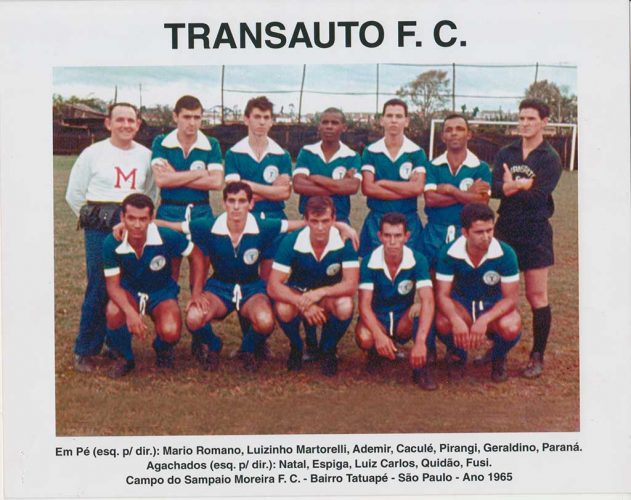 Em pé o saudoso Mario Romano que prestou relevantes serviços ao futebol, Luizinho Martorelli, Ademir, Caculé, Pirangi, Geraldino, Paraná. Agachados da esquerda para a direita Natal, Espiga, Luis Carlos Munari, Quidão, Fusi. Como sempre dizia o saudoso Alberto do Carmo Araújo “Giba” – “Recordar é viver” – Transauto Futebol Clube uma das grandes forças esportivas que muito colaborou na formação das consagradas equipes da região abeceana. Colaboração do considerado Luiz Domingos Romano, designer que nos auxilia na divulgação das coisas do futebol, principalmente nas partidas da AD São Caetano onde todas as equipes que nos visitam fazem parte da grandiosidade na divulgação do plantão esportivo no lendário Estádio Municipal Anacleto Campanella, 65 anos de existência no bairro Olímpico.