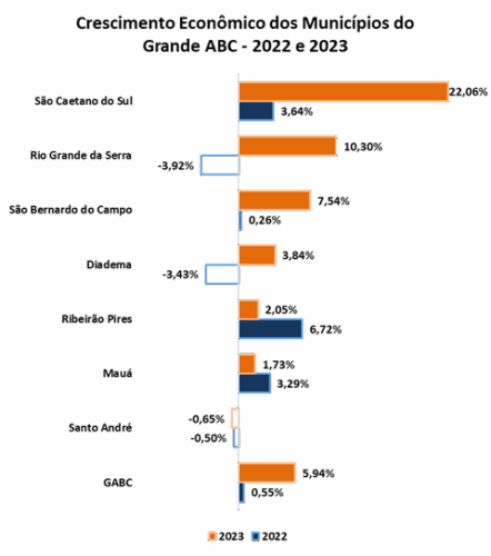 No biênio 2022 e 2023 a economia do Grande ABC cresceu 6,52% em termos reais, descontado o efeito da inflação. Neste mesmo período a economia brasileira 6,3%, a economia paulista 11,1% e a RMSP 12,2%. Os dados oficiais sobre o desempenho do PIB municipal são divulgados com defasagem de aproximadamente 2 anos, dada a complexidade técnica e metodológica envolvida no detalhamento dessas informações.