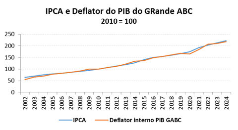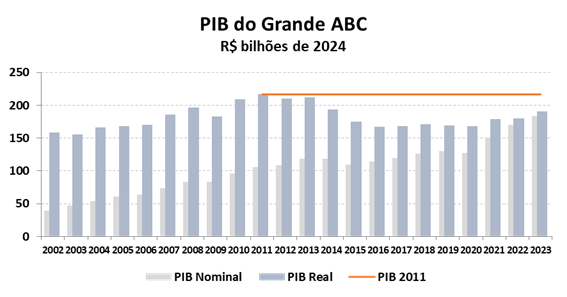 O PIB da Região do Grande ABC no ano de 2023 se mostrou 12% abaixo do observado no ano de 2011, quando excluído o efeito da inflação do valor do PIB nominal dos diferentes anos. Para tanto, utilizou-se o deflator do PIB do Grande ABC, calculado e disponibilizado pela SEADE.