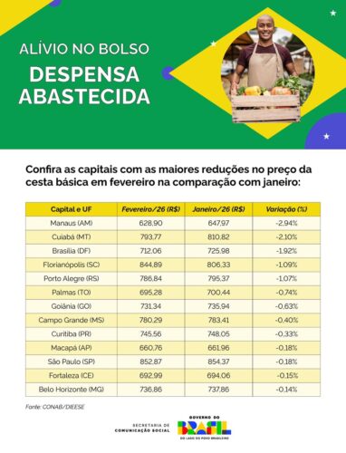 Entre dezembro de 2025 e fevereiro de 2026, foram registradas quedas no preço médio de 8 dos 13 produtos que compõem a cesta básica: óleo de soja (-4,56%), açúcar refinado (-3,95%), arroz agulhinha (-3,74%), leite integral (-2,67%), banana (-2,63%), café em pó (-1,89%), farinha de trigo (-1,68%) e batata (-0,48%). Os outros cinco itens apresentaram elevação de preço: tomate (10,97%), feijão carioca (6,51%), manteiga (0,88%), pão francês (0,82%) e carne bovina de primeira (0,73%).